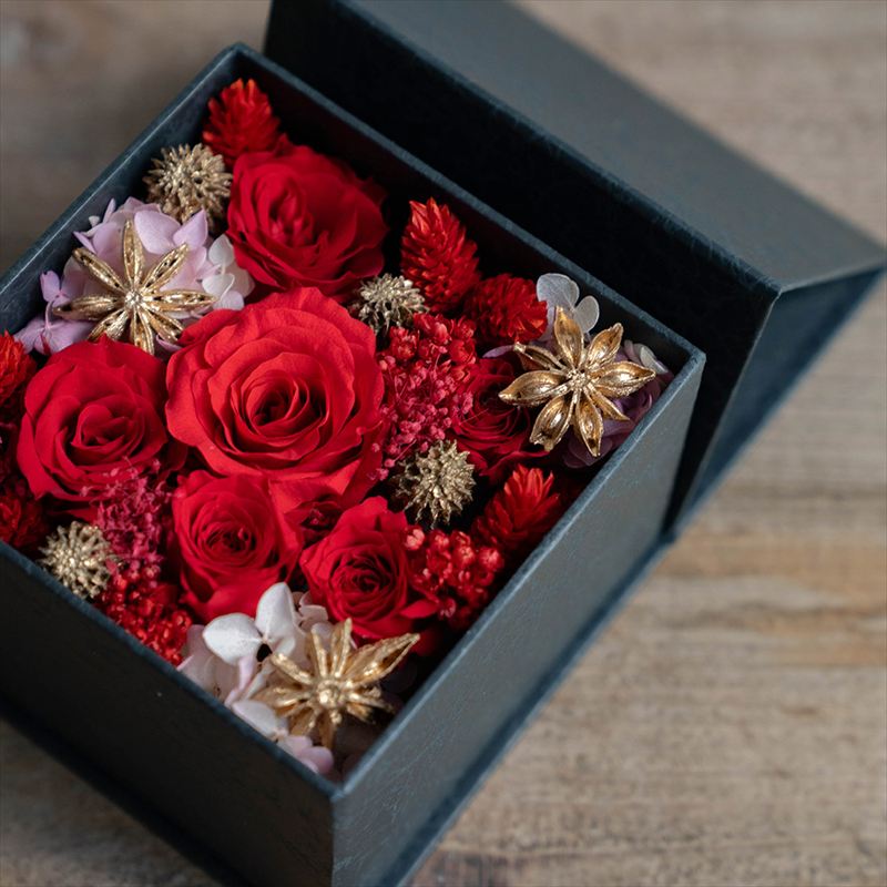2025ホリデーシーズン限定のプリザーブドフラワーボックス。数量限定で用意されたスペシャルなアイテム。自分自身へはもちろん、お世話になった大切な人へのギフトにも最適です。