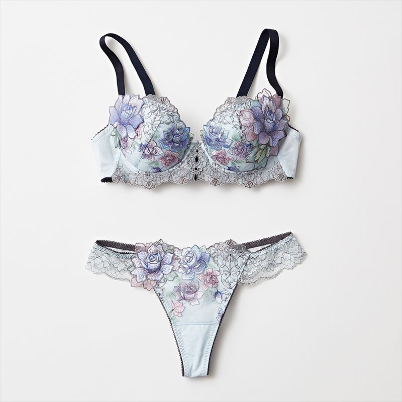 深い谷間が作れるプッシュアップタイプのブラとお揃いのショーツ。アルフォンス・ミュシャの作品がインスピレーション源で、透明感のある色彩をオンプリント手法で表現したゴージャスながらも軽やかな印象のコレクション。