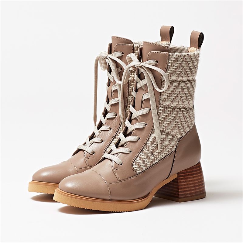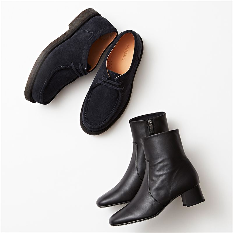 手前:晴雨兼用の撥水シープレザーを使用した履き心地抜群のショートブーツ。ライニングに発熱機能素材を使用し、寒い季節も大活躍。