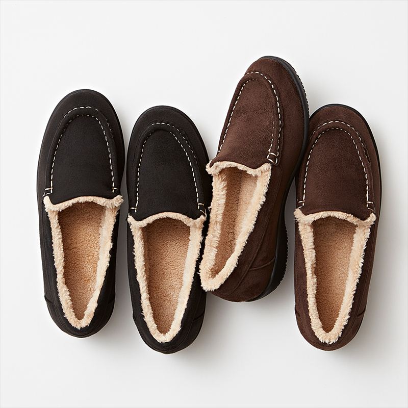撥水加工を施した、上品なスエード調素材のモカシンシューズ。内側はふんわりとしたファー仕様で、足元を優しく包み込み暖かさをキープ。軽量性と防滑性を両立したゴム貼り底を使用し、歩きやすさも抜群です。