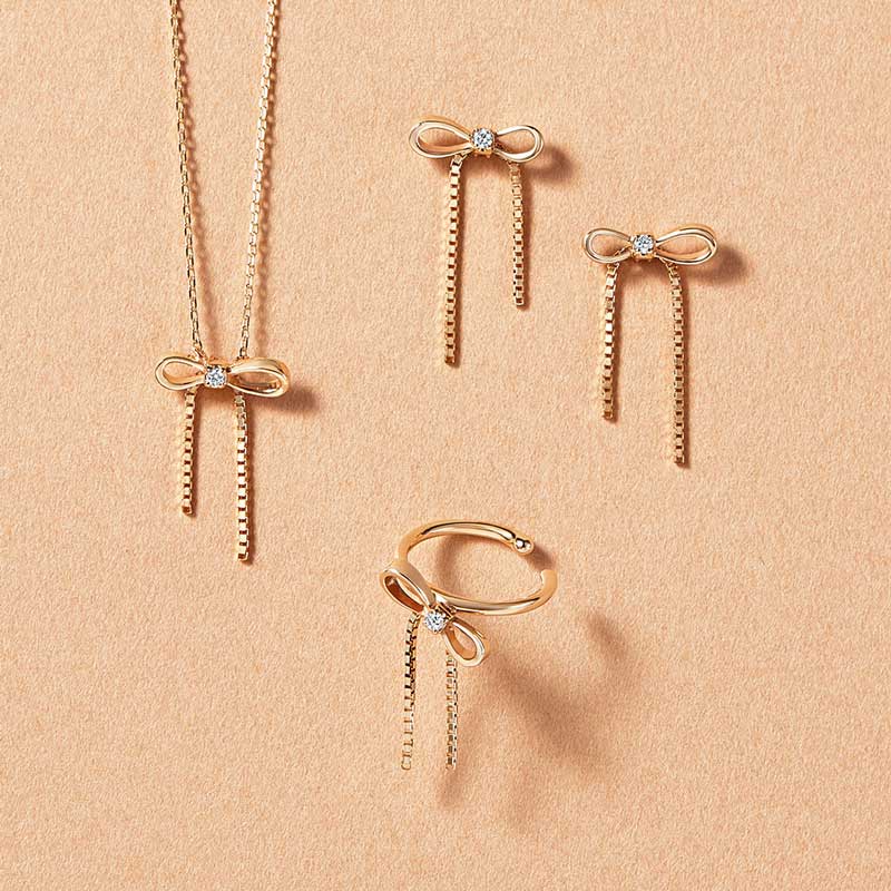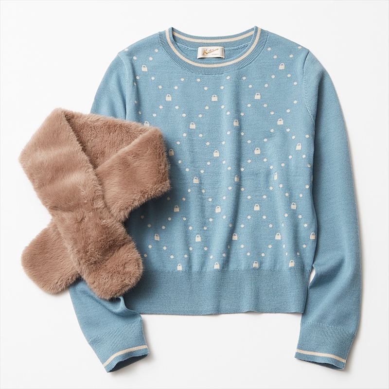 ニット:バッグモチーフを散りばめたアーガイル柄デザインがポイントのニットは、ややゆったりとしたシルエット。 マフラー:ループ部分のリボンが可愛らしいフェイクファーを使用したマフラー。首に巻くだけで華やかな印象に。