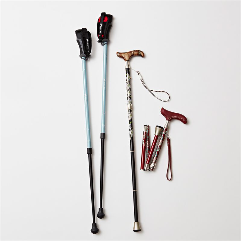 右:約26cmとコンパクトになる折り畳みモデル。乗り物での移動時にも便利。さまざまなシーンで大活躍。 左:しっかり歩けるグリップで、初めての人にもぴったりな基本のウォーキングポール。国産高品質でアフターサービスも充実。