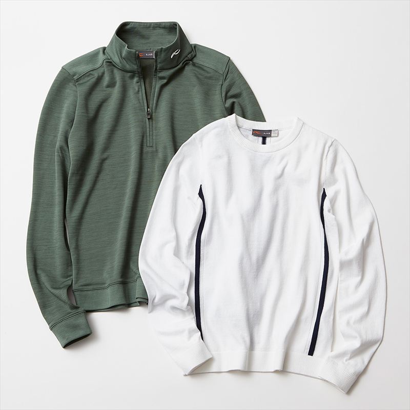 左:高級感と機能性を兼備したハーフジップ。メリノウールと機能性繊維を組み合わせ、柔らかな肌触り、伸縮性、天然の抗菌性を実現。 右:速乾性に優れた糸を使用し、背中にはベンチレーションを施し、高い通気性が快適さをキープ。