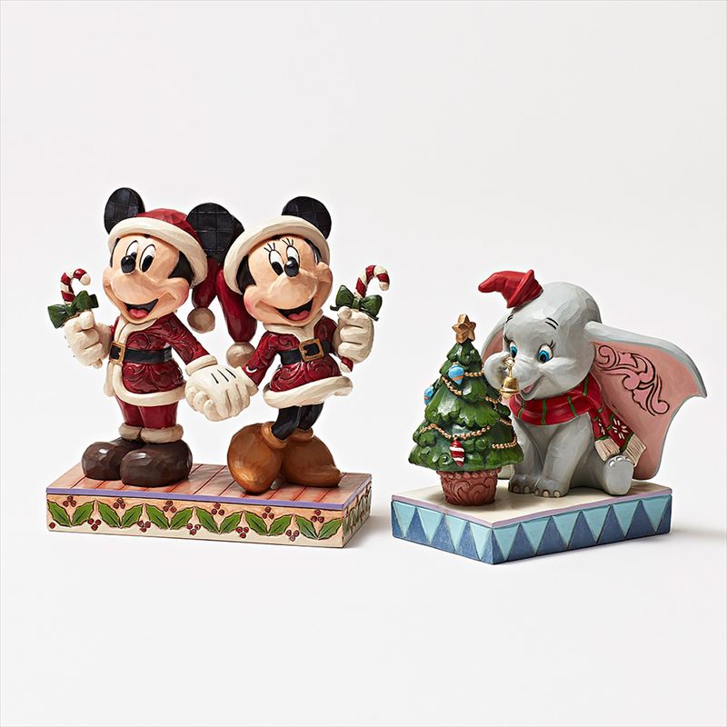 右:ダンボが赤いマフラーと帽子を着けたホリデー作品。お鼻でベルをツリーに飾るダンボの姿がキュート。 左:まるで絵本から飛び出してきたような愛らしさのサンタ姿がかわいいミッキーとミニー。大切な人への贈り物にもおすすめ。